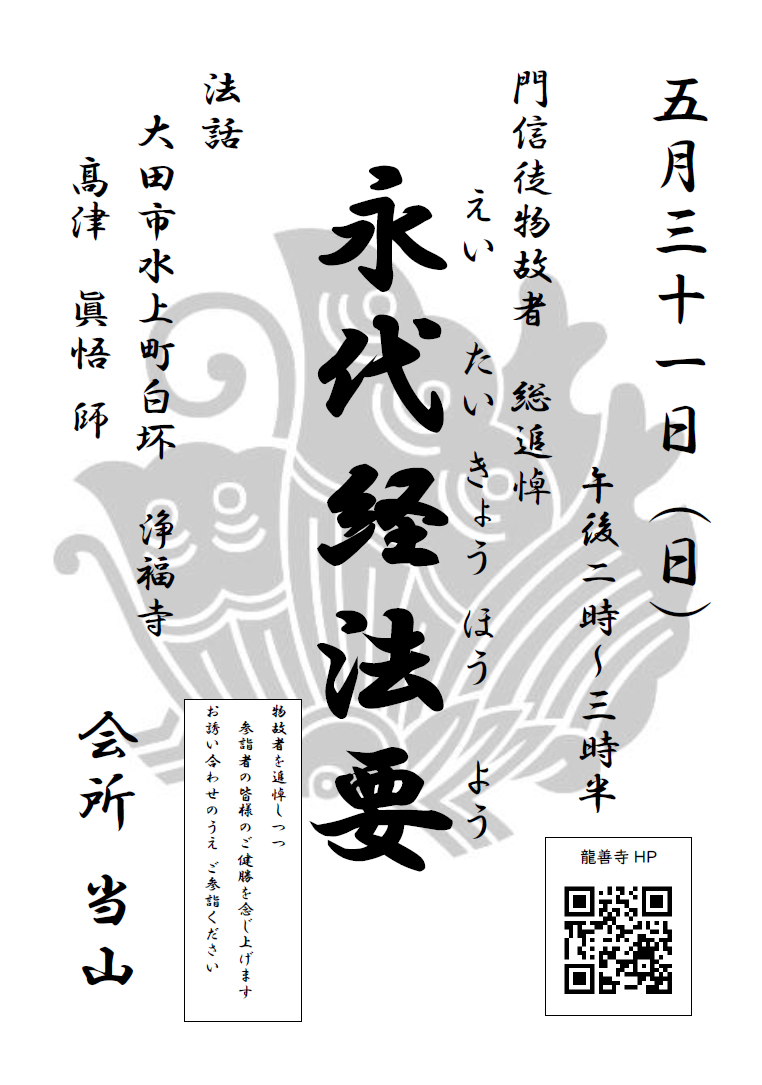出雲市にある龍善寺(ryuzenji temple)は、鳶ヶ巣城主宍道氏の町屋敷跡地に開山して以来、400年の歴史を有する浄土真宗の寺院です